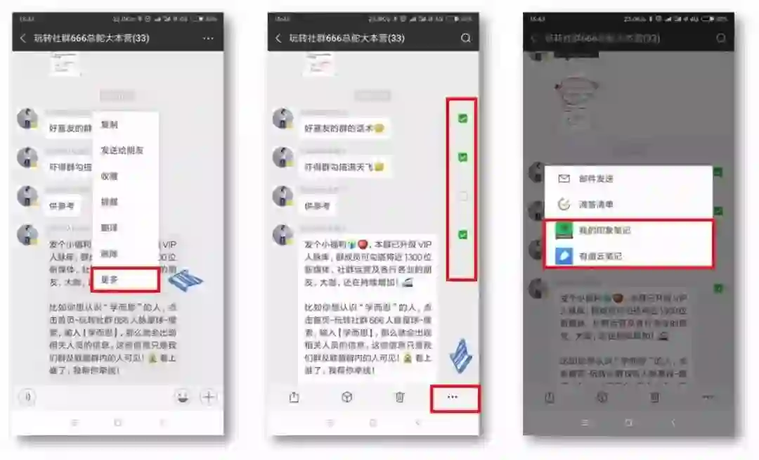 22、要导出微信群聊天记录,可选择安装有道云笔记或印象笔记,长按聊天记录,点击更多,可以勾选多条聊天记录,然后点击底部的“...”,在弹出菜单选择发送到有道云笔记或印象笔记,即可导出