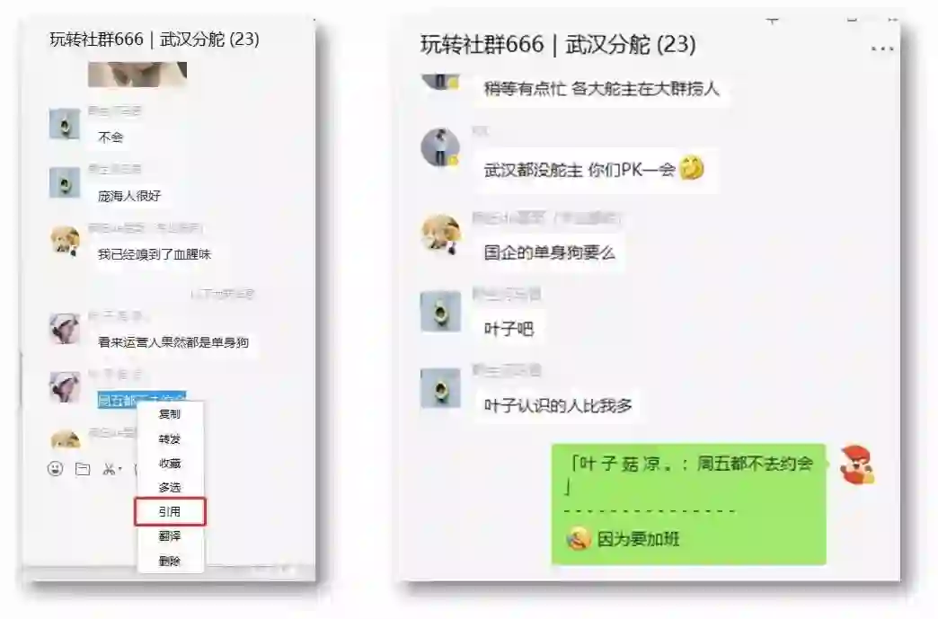 17、微信群要回复某人单条信息,微信pc电脑端,右键点击某条聊天,可引用该聊天进行回复