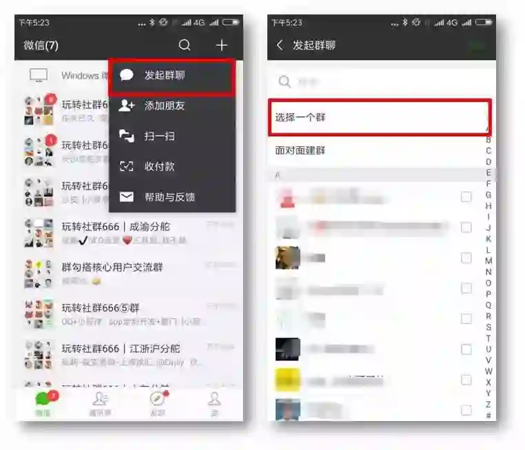 4、每个微信号建群有上限,先用拉人的方式建群,上限后可选择面对面建群。