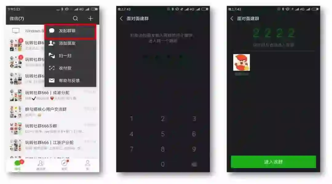 3、建一个只有自己的群,拉2个好友再把对方删掉或者直接选择面对面建群,输入相同的4个数字就可以进入一个群聊,可以用来做文件传输、草稿、游戏复活等等,操作同上。