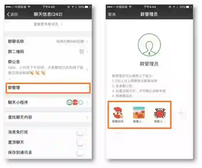 被设为管理员后,则可以有【群聊邀请确认】和【移除群成员】等功能权限。从此以后,一个微信群,可以有多个管理员帮忙打理拉~~~