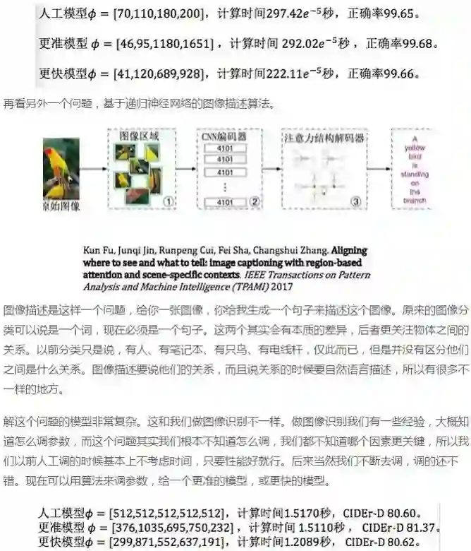 结构优化是一个离散优化问题,所以我们用前边很多的贝叶斯方法、求导方法不能用,所以通常情况下,都是人工做的。如果我们在座的有老师,让你的学生去调参,说你要网格搜索,他可能会拒绝,他说这事我搞不定,这个参数组合太多了,另外,我们机器承受不了,我算一次就要1天、2天,我这样一组合可能要几百次、几万次人工调参数。所以人工调参数费时费力。此外,就是需要特别多的知识,你要有很多的知识和经验才能调好参数,对专家的依赖性很强。更关键的问题是,我好不容易花一个月把参数调好,现在换一个数据集,我还需要再花半个月时间调参。另外是当你的应用场景发生变化的时候,新的客户来了,这个时候你不得不调,非硬着头皮做不可,所以熬夜就成了家常便饭。