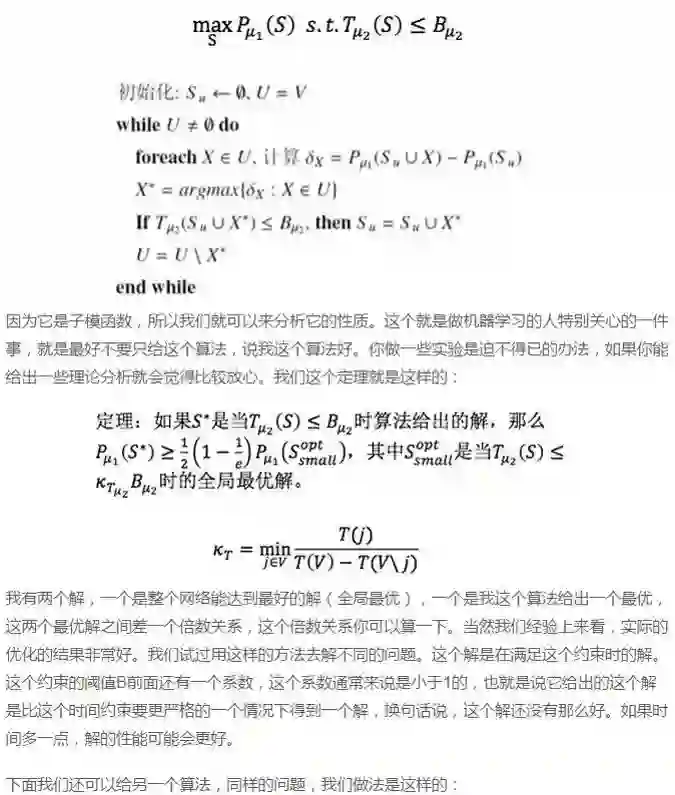 子模函数和超模函数是后边的网络结构优化要用到的知识。介绍的时候我先说明,这里面大概有10页左右的PPT是从这个网站上拿过来的(网址:http://www.select.cs.cmu.edu/tutorials/icml08submodularity.html)。在2008年国际机器学习大会有一个特别好的tutorial,就是关于子模函数和超模函数。那个报告给我印象深刻,所以我就把其中的几页拿过来在上面做了一些改动。不管怎么说,谢谢这两个作者。课后大家如果对这个有兴趣,可以去看看他们很完整的PPT。他们对子模函数和超模函数介绍非常详细,很感谢他们。