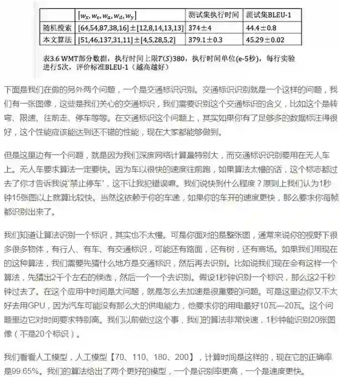深度学习方法应用有很多好处,同时也有很多问题。比如说,深度学习网络模型计算量特别大、模型特别复杂。模型复杂导致两个问题,第一是训练上的困难,第二个是测试上的困难。训练上的困难在于它需要大量的时间,而且一个深度学习网络要想在某个问题上达到特别好的实用化性能,需要特别多的数据。而这对于机器计算的要求、对于数据的要求,通常来说不是我们在高校擅长满足的。因此,工业界就显得很有优势,他们有数据、有计算资源。现在深度学习的技术进步了,但是训练模型依然要花费很长时间。像我们实验室动不动训练一个模型就要一两天的时间。另外测试时间也很长,我给一个数据,跑神经网络,最后从末端给出一个结果。这个过程看起来只有一遍过程,但是由于中间计算过于复杂,所以时间仍然很长。比如给一张图像,通常来说如果代码写的不够好,大概需要几秒的时间,如果写的特别糟也可能一分钟的时间。可是我们知道有些应用问题不允许你这样做,它需要你实时地识别图像。还有就是对内存有要求。神经网络模型有大量的参数都要存到计算机里去。如果你用的是服务器,这就没问题,但当你的这个技术走向应用变成产品,这就不一样了。比如说无人驾驶车,我们希望无人驾驶车上装的摄像头能够识别路上的情况、标识一些物体,你如果这么做,就要在无人驾驶车上有一个识别设备。我们知道无人驾驶车是一个那么有限的环境,它不太可能让你放一个服务器或GPU,所以它的计算能力很弱。还有就是它对于电的要求高,我们知道GPU特别费电,车上不太可能放一个几百瓦、上千瓦的供电系统。所以有人对AlphaGo的一个批评就是,你和人去比赛,人靠的是什么,喝一杯牛奶、一片面包、一个鸡蛋就来参加比赛;AlphaGo靠什么,后面有那么大的一个供电系统。还有一个特别理想的状况,既然深度学习做图像识别已经有了很多突破,为什么不用在手机上?可是一旦考虑用在手机上,就发现有一堆的问题:内存太小、计算能力太弱、耗电太厉害,所有这些东西都导致了神经网络现在在应用阶段有非常大的困难。