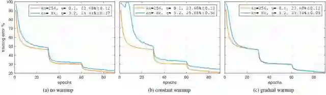 为了克服minibatch过大的问题,Facebook团队使用了一个简单的、可泛化的线性缩放规则调整学习率(learning rate)。为了成功应用这一规则,他们在训练中增加了一个预热阶段(warm-up phase)——随着时间的推移,逐渐提高学习率和批量大小,从而帮助保持较小的批次的准确性。在训练开始时使用较低的学习率,克服了早期的优化困难。重要的是,这种方法不仅符合基线验证误差,还产生与了比较小的minibatch基准线匹配的训练误差曲线。