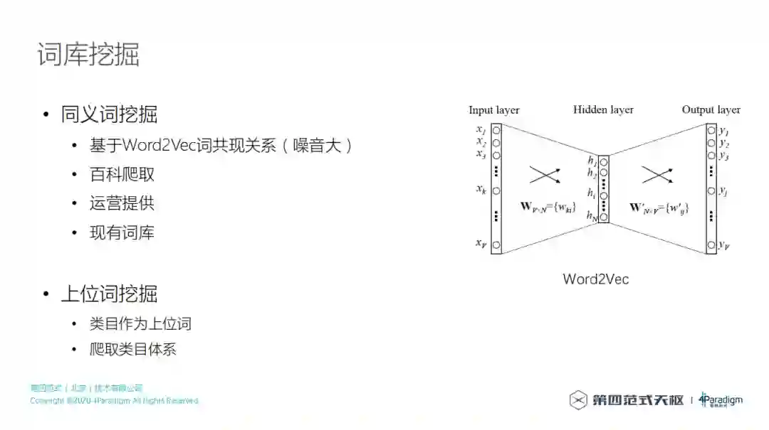 那么如何挖掘上位词,举例理解上位词,比如商品类目就是具体商品的上位词,矿泉水的上位词就是饮用水。词库的构建是做搜索必要的工作,但是在构建词库的过程中,不一定是手工的过程,完全可以用其他的自动化方法甚至模型去筛选词库,最后再做一些人工纠正。