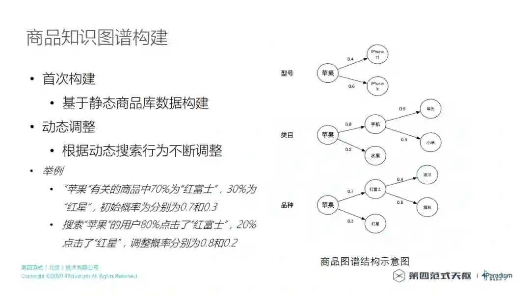 如何构建商品知识图谱,我们可以构建很多种不同类型的知识图谱,本文是根据不同实体来构建知识图谱,比如按照三种实体类型来构建知识图谱,像上图最右侧的示意图,苹果有很多种型号,如果用户搜索苹果,用户有可能想买iPhone 11、iPhone X或者还是没出来的iPhone 12,可以通过先验知识,把知识图谱构建出来,最后排序时可以把这些知识融入进去,比如用户都更加倾向于去买iPhone X,后面排序的时候iPhone X就会更靠前一些。对于类目来说,搜索苹果有可能是一个手机,也有可能是水果,那到底是想买手机还是想吃水果,是有一个概率的,不同用户有不同的倾向性,但是目前我们构建的图谱还不能做到特别个性化,它只是一个宏观的统计,搜苹果时有80%的用户其实是要买苹果手机的,有20%的用户要买水果,这样就给了我们一种排序的参考。知识图谱其实是做了一个非个性化全局的知识构建,通过商品库去分析静态概率,最后根据用户点击行为会做一些动态调整,调整完的知识图谱再用在后面的排序上。