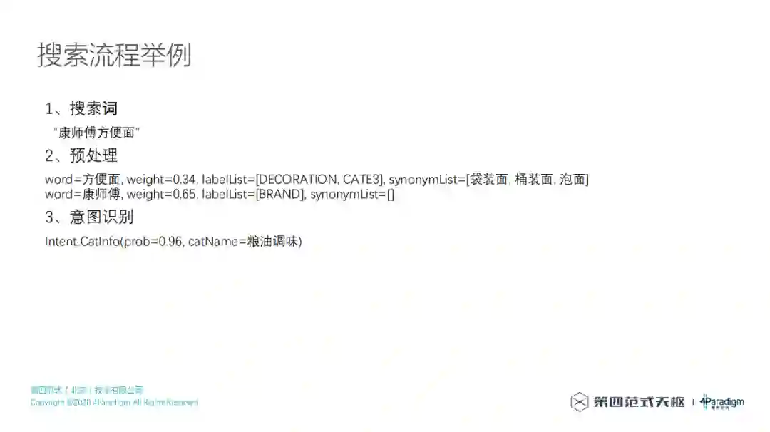 以上,逐个讲了整个搜索的流程,那么现在分步的去看搜索一个词时是怎样的过程。第一步会先输入搜索词"康师傅方便面",第二步预处理,预处理会做一些事情,首先是分词,之后会算出来该搜索词可能的实体类型,比如康师傅是一个品牌,它识别出康师傅是一个品牌,方便面可能是一种修饰语,也可能是一种类型,还有一些同义词:袋装面、桶装面和泡面,做完第二步的处理,会拿到这样一些处理结果;第三步意图识别,可以看到有96%的概率所属类目是粮油调味;