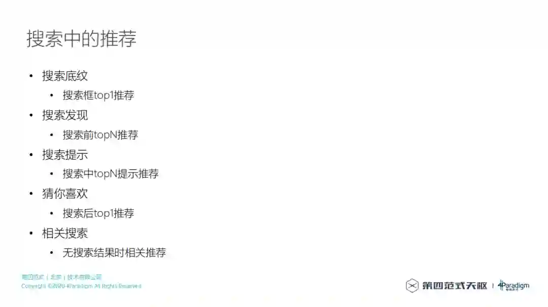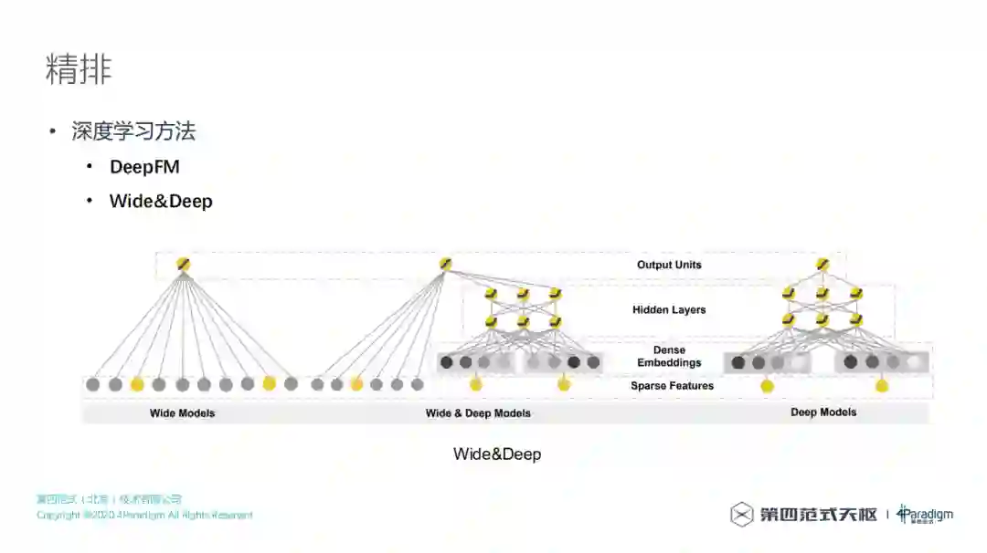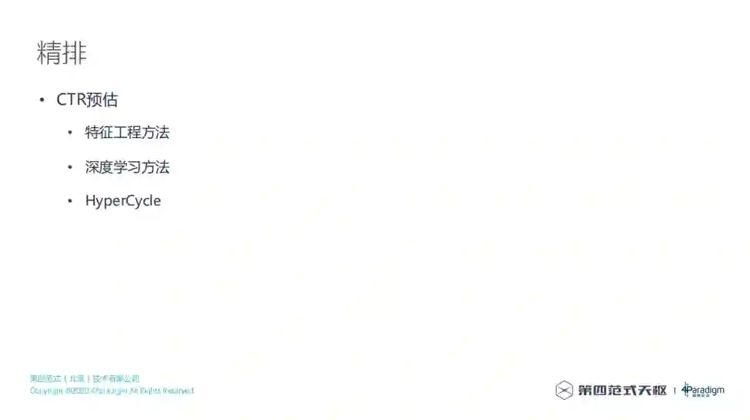 得到粗排结果以后,接下来就是精排,对于搜索来讲,目前来讲主要的优化目标是CTR,用的主要是CTR预估方法,CTR预估有很多不同的方法,比如传统的特征工程方法、深度学习方法等,也可以使用第四范式自研的HyperCycle。