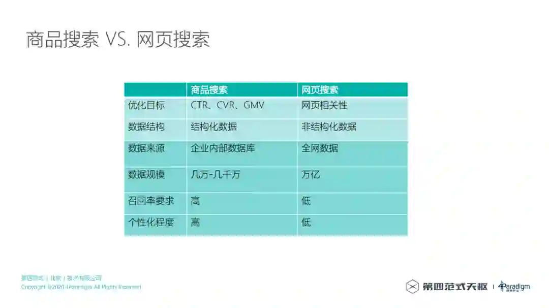 从数据规模来讲,网页搜索使用的数据一般是万亿级的规模,有超过万亿的网页,但是商品搜索的话,根据客户规模的大小,商品的SKU数或者SPU数基本上是几万到几千万这个级别,与网页搜索不在一个量级。