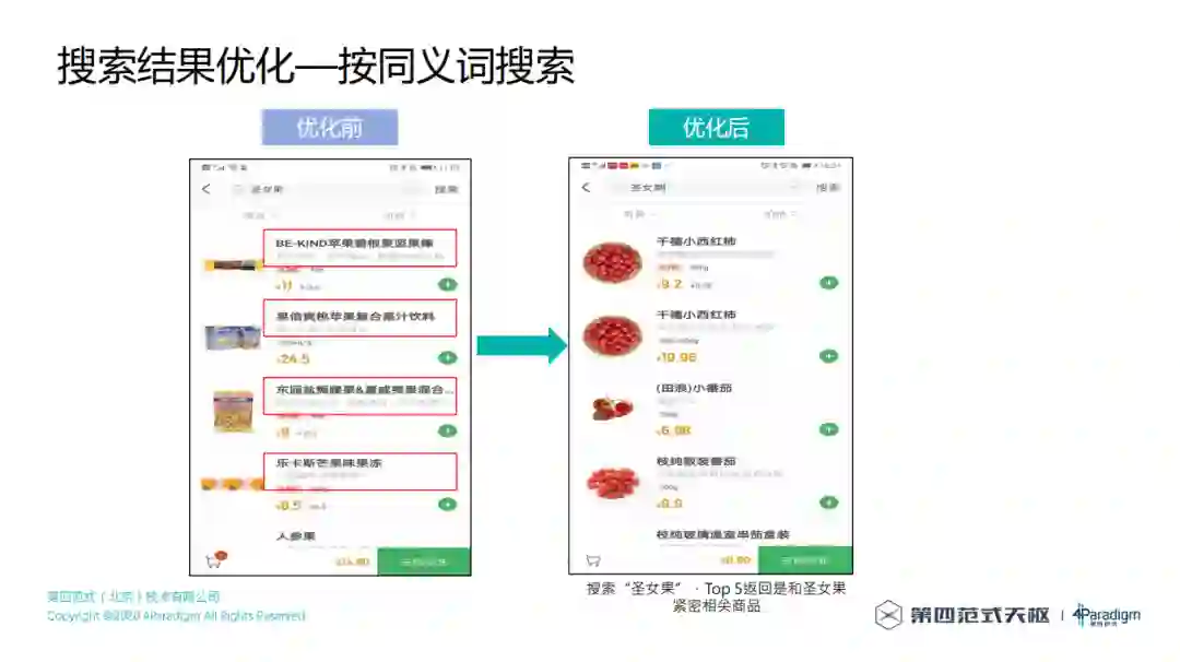 按同义词搜索,优化前搜索"圣女果",Top5返回了"果汁饮料"、"芒果味果冻"毫不相关的商品,优化后搜索"圣女果",Top5返回是和圣女果紧密相关商品。