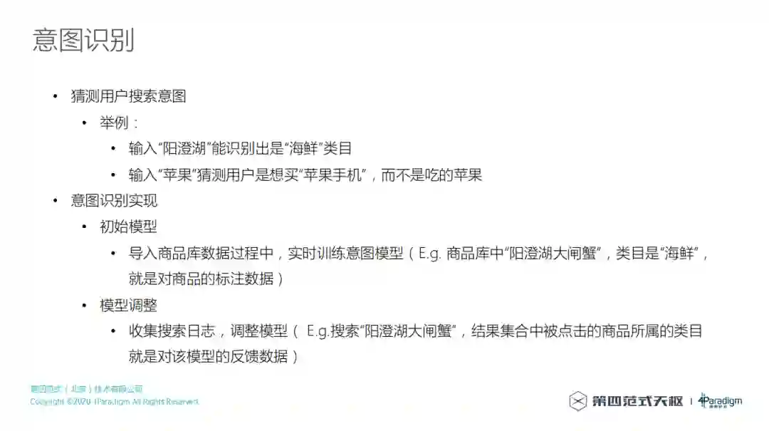 那么如何做意图识别,使用用户导入的物料库自动的去训练意图模型,意图识别就是去做类目预测,甚至去做一些字面没有表达出来的其他实体类型的预测。在初始的物料库里面,商品的各种属性就是一些天然的标注数据,使用这些标注数据去训练一个初始的意图模型,来预测隐含的实体类型,当这个初始模型训练完成之后,再用搜索日志去动态调整这个意图模型。