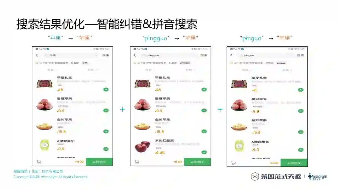 优化后,可以进行智能纠错和拼音搜索,比如搜索 "平果"、"pingguo" 和 "pinguo" 时,都能准确搜索出苹果相关的商品。