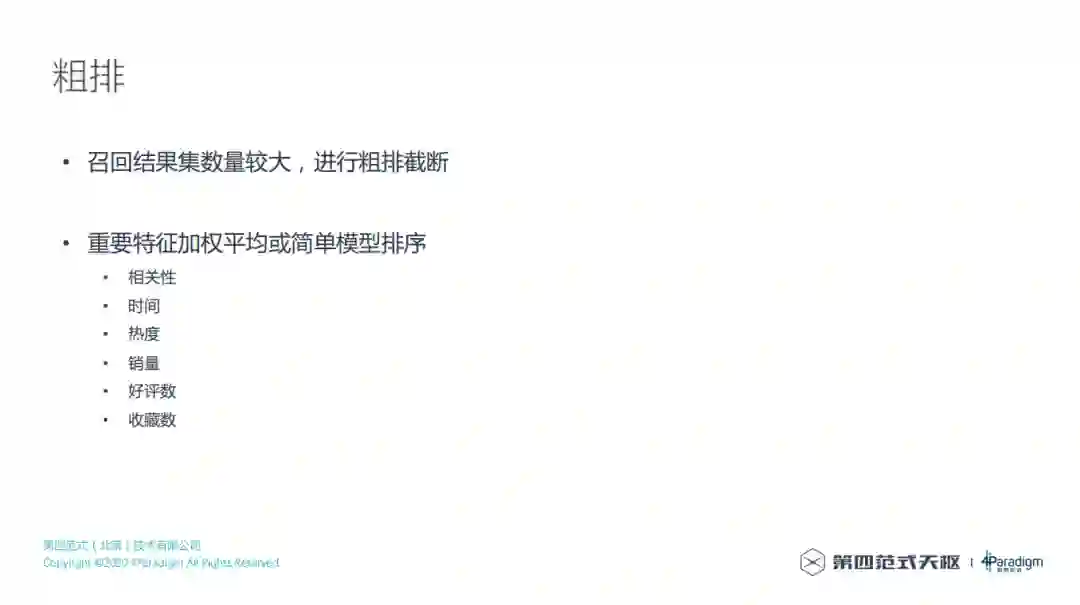召回的工作完成之后,接下来就是粗排,可以使用简单的模型来粗排,这个模型里面的特征可以用相关性 ( 搜索和推荐不同,搜索一开始就会有相关性,但推荐就不会有相关性,推荐不会先输入一些搜索词 )、时间、热度、销量、好评数和收藏数等等特征,训练出简单的模型,做一些粗排的排序,进行截断,进入下一个环节,想要更简单的话,可以找出核心的特征,做加权平均也可以。粗排还不能达到个性化的效果,当然也可以把粗排做得更个性化,可以根据不同搜索的用户做个性化的粗排模型。
