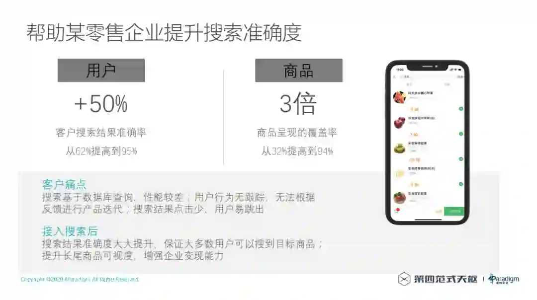 在一些零售企业场景应用之后搜索结果准确率提升了50%,整个商品的覆盖率提高了3倍,解决了客户的搜索体验痛点。