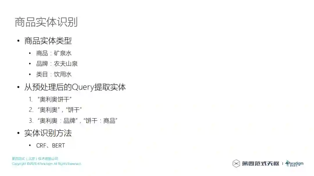 做完预处理之后,得到了用户搜索词分词的结果,拿到这个分词结果,要把分词结果里面每一个词识别成一个实体,什么是实体呢?在电商里面的实体类型其实有很多,这里列出了三种,有商品实体类型,矿泉水就是一种实体,属于商品实体类型;农夫山泉是品牌这种实体类型;饮用水是一种分类或者叫类目,这些都是实体类型,实体类型下面有具体的实体,实体就是矿泉水,农夫山泉,所以需要知道输入的词到底是一个什么实体,比如说输入“奥利奥饼干”,做完预处理之后,得到“奥利奥”和“饼干”两个词,这个时候就需要做实体识别,识别后可以知道“奥利奥”是一种品牌,“饼干”是一种商品,这样就能做后续的处理。