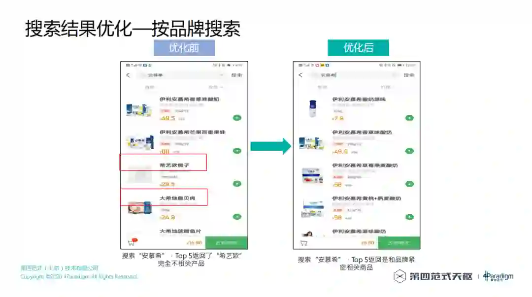 按品牌搜索,优化前搜索"安慕希",Top 5返回了"希艺欧"完全不相关商品,优化后搜索"安慕希",Top 5返回是和品牌紧密相关商品。