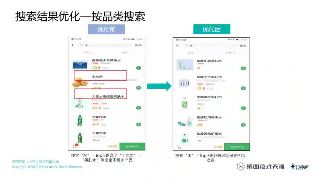 按品类搜索,优化前搜索"水",Top 5返回了"丰水梨"、"柔肤水"等完全不相关产品,优化后搜索"水",Top 5返回是和水紧密相关商品。