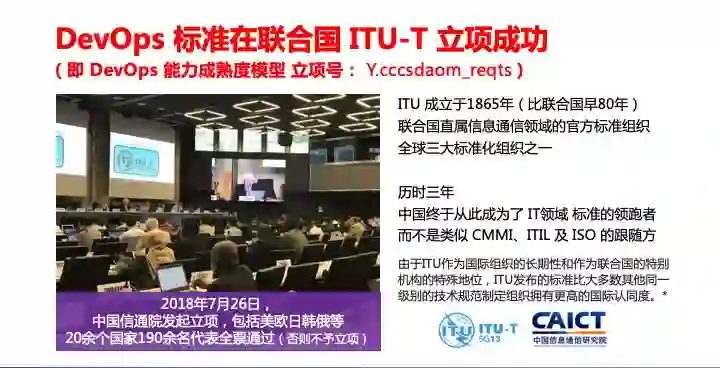 目前,由中国信息通信研究院主导的DevOps 标准已在联合国直属标准化组织 ITU-T、中国通信标准化协会(CCSA)正式立项。