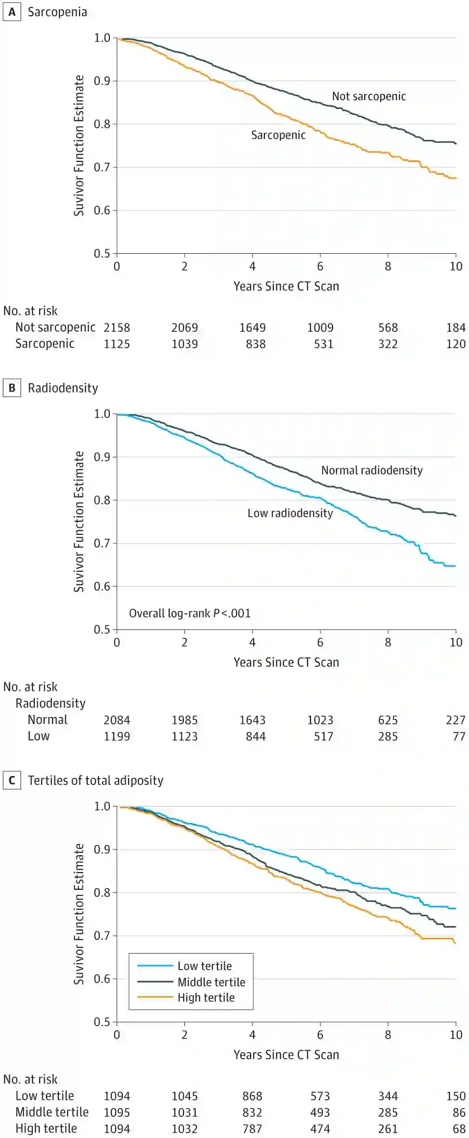 中位随访时间为6.0年,3241例患者中有619例死亡。 在诊断原发性乳腺癌时,1086例患者(34%)出现肌肉减少症,1193例(37%)患有低肌肉放射性密度。伴有肌肉减少症和低SMD(即肌肉质量)的患者年龄更大(分别为57.0岁对52.7岁,60.6岁对50.3岁),并且不太愿意接受化疗。伴有肌肉减少症(n = 1086)与无肌肉减少症(n = 2155)的女性更常见于白人(74.4%比67.8%)和亚洲人(15.3%比11.2%),黑人(3.1%比9.3%)和西班牙裔5.3%vs 10.5%)。Kaplan-Meier曲线显示,与没有肌肉减少症的人相比,患有肌肉减少症的患者(log-rank P <0.001)、低SMD(log-rank P <0.001)、中等或高总肥胖患者(log-rank P <0.001)总体生存更差。