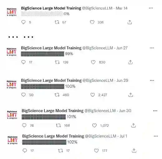 为了让小伙伴不错过大模型BLOOM训练成长的每一天,更是为其开通了twitter账号,从此开启了每日汇报训练进度的日常。从0%开始,到99%、100%,经过111天,模型终于训练完毕。不过,BigScience说让子弹再飞一会,模型会继续训练几天,当然每日的推文就变成了训练进度101%、102%... ... 马上小伙伴们就可以亲自测试BLOOM大模型的效果啦!