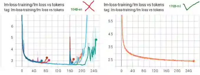 21年底-22年初,尝试训练千亿参数的多语言预训练语言生成模型,并进行了一系列参数量、数据集、模型架构等方面的探索。期间遇到了很多难题,例如1040亿参数的模型训练不收敛,反而1760亿参数的模型训练很稳定以及数据质量不达标。