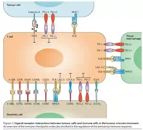 免疫检查点阻断疗法发挥抗癌作用是通过激活抗肿瘤免疫反应。其中,T细胞在对抗癌症的免疫防御机制中扮演着重要角色:它们识别肿瘤抗原,然后被激活、传播,最终消灭癌细胞。事实上,T细胞的激活受T细胞、树突状细胞、肿瘤细胞和肿瘤微环境(TME)中巨噬细胞上配体-受体(ligand– receptor)相互作用的调节。这些受体-配体对(receptor–ligand pairs)被称为免疫检查点。图1汇总了参与调节抗肿瘤免疫反应的免疫检查点分子。