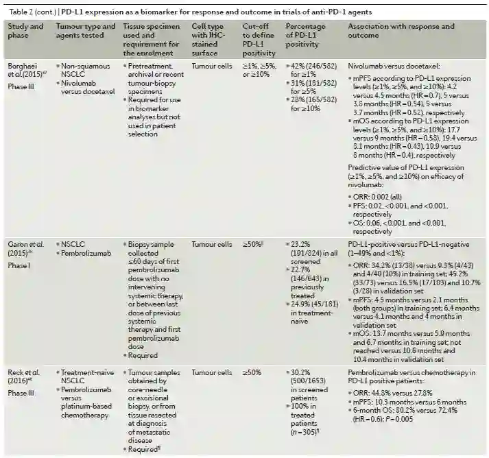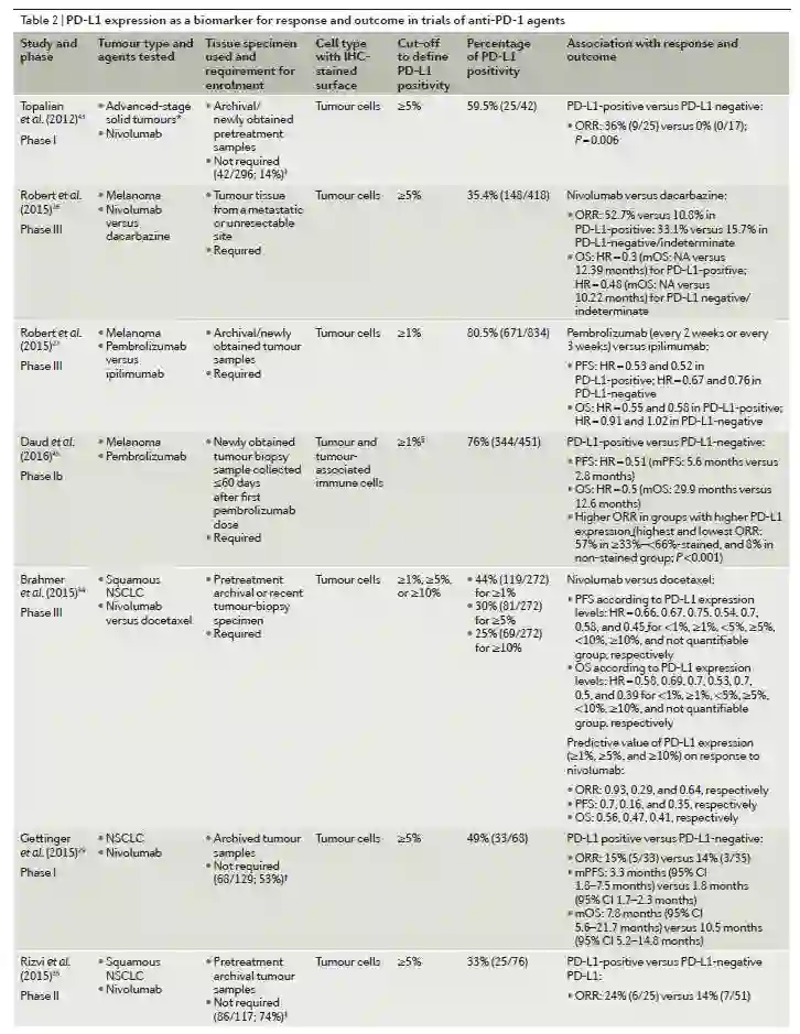 将肿瘤细胞上PD-L1的表达水平作为免疫检查点抑制疗法的潜在生物标志物的研究在这类疗法发展的早期就已经开始了。下表是作者们汇总的一些相关临床试验结果。该部分内容讨论了将PD-L1作为生物标志物的合理性以及存在的一些问题。