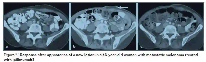 由于免疫检查点抑制疗法引发了独特的抗肿瘤机制,因此,使用这类药物的患者可能会产生传统的肿瘤响应标准(tumour-response criteria,如WHO标准、实体瘤响应评估标准(RECIST))中没有包含的肿瘤响应模式。举例来说,在用免疫检查点抑制剂治疗的一小部分患者中,响应可能在肿瘤负担初始增长后(after an initial increase in tumour burden,图2)或者新病变出现时或出现后(during or after the appearance of new lesions,图3)才被检测到。根据WHO标准和RECIST,这些事件将被归类为肿瘤进展,也被称为“假性进展”(pseudoprogression)。在假性进展的情况下,成像所检测到的肿瘤体积的增加被认为是T细胞浸润(免疫激活的结果)导致的,而不是由肿瘤细胞增殖引起的。