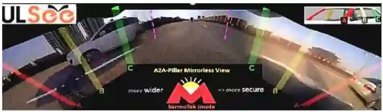 而 ULSee 的 3D 全景行车监控影像系统利用 3 个广角鱼眼镜头取代传统后视镜,摄取左右及后方 270 度的图像,可以从一侧 A 柱覆盖到另一侧 A 柱,完成 3D 立体影像的实时缝合,可视距离为 35 米,实现无盲区零死角,具备更加广阔的视野。