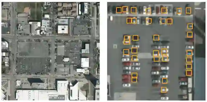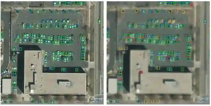 空中成像的目标物体检测对标准网络架构的挑战。两张图片来自统一数据集。左图中的模型将4000×4000像素的测试图像降采样到416×416,图中共有1142辆车,没有一辆被识别出来。右图中的模型同样是416×416,漏报率过多是由于车辆密度太大,13×13的网格无法将它们分辨出来