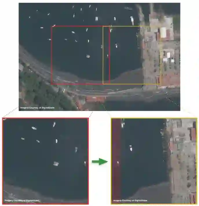 DigitalGlobe在巴拿马运河附近拍摄的8×8km(约16000×16000像素)的图像,GSD为50cm。红框表示416×416像素大小的区域
