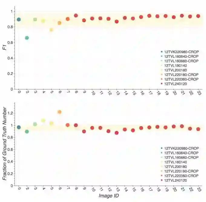 接着,我们在COWC数据集上测试了YOLT对汽车的检测结果,下图是在每个场景中模型的F1分数以及对汽车数量计算的精确度: