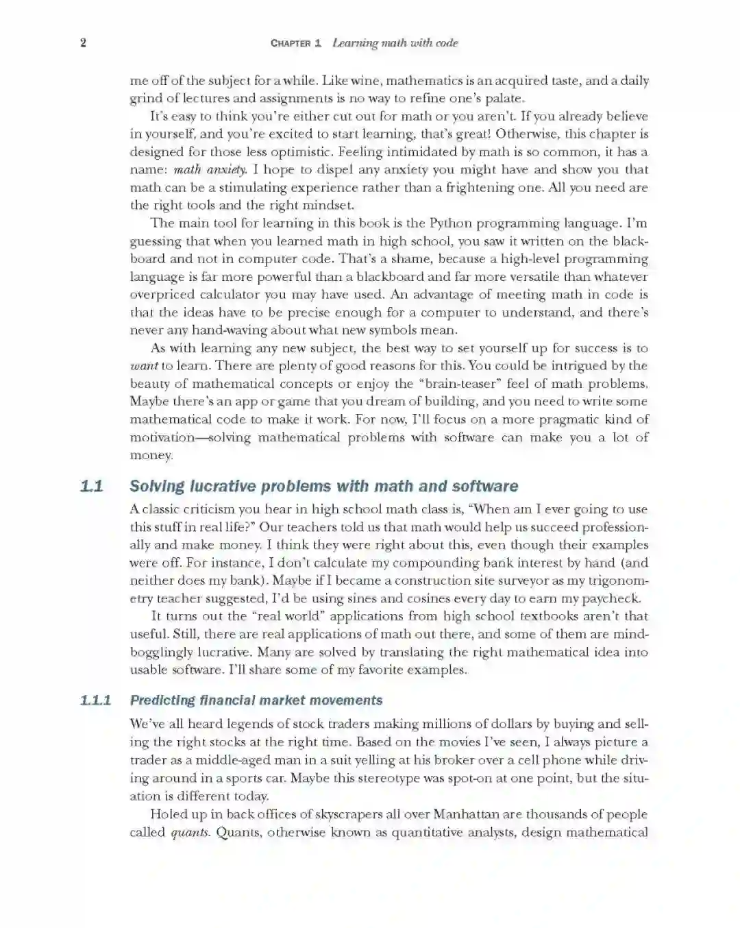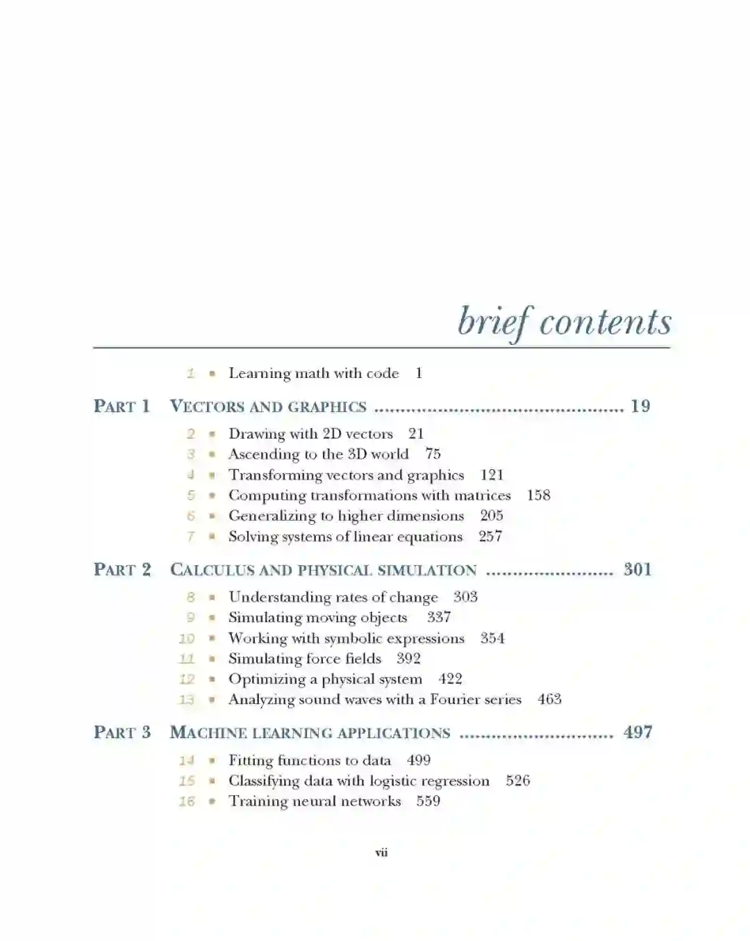 数学在其他现代应用中也扮演着不可或缺的角色,如游戏开发,计算机图形和动画,图像和信号处理,定价引擎和股票市场分析。无论你是一个没有核心大学数学基础的自学成才的程序员,还是你只需要重新点燃数学余烬,这本书就是激发你技能的好方法。