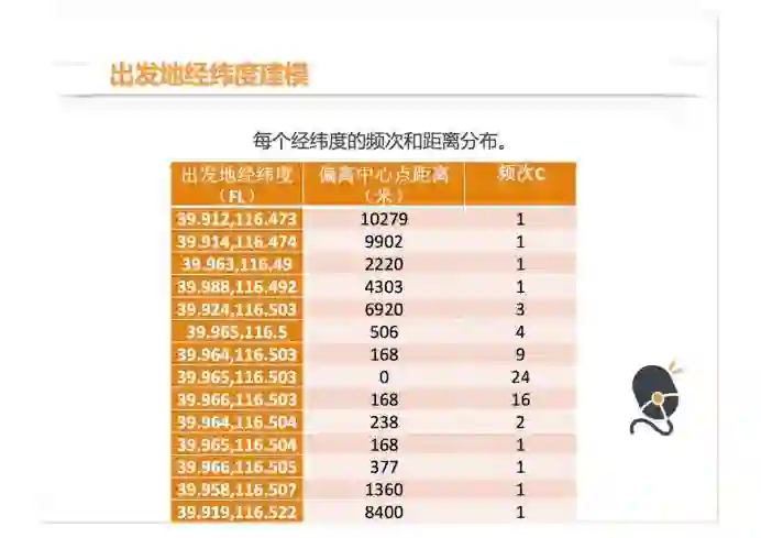 简单的模型之后,下一步我们要追求更好的效果,也就是要一步步把这个模型做的越来越复杂。首先我们看另一个单一的特征,这次不选出发时刻了,选出发地经纬度。下面是一个用户出发目的地出发经纬度的聚合,这个特征也具有正态分布的性质,有一个中心点,离这个中心越来越远,对应的频次会越来越低。