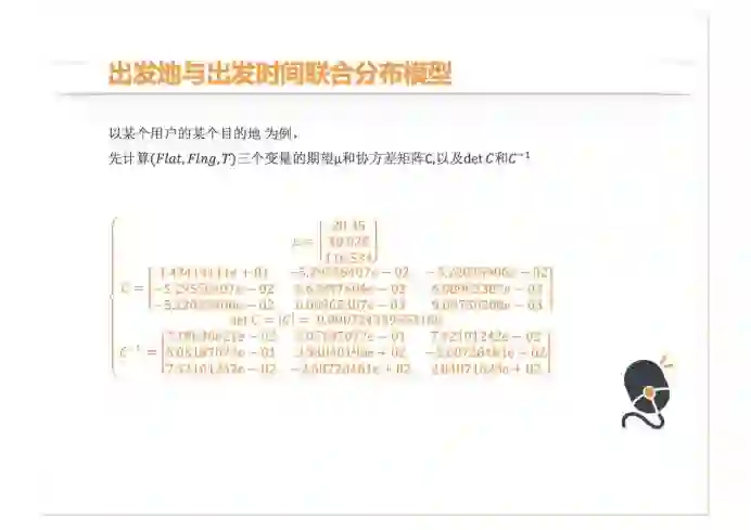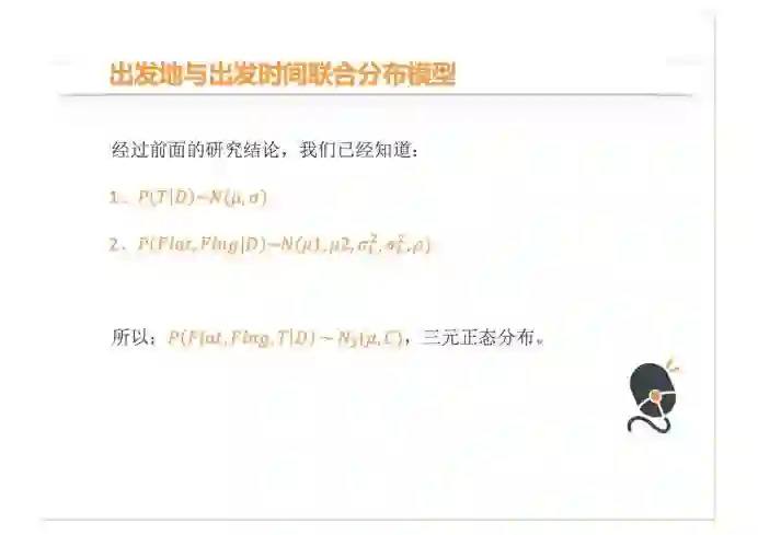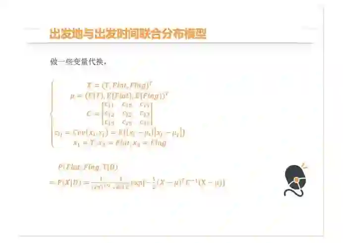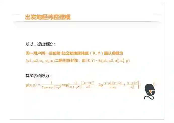 画一个三维图像就是这样子,所以说我再提一个假设,同一用户同一目的地下的出发地经纬度符合二维正态分布,具体密度函数是下面的公式。