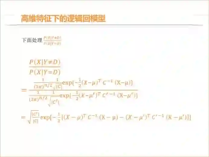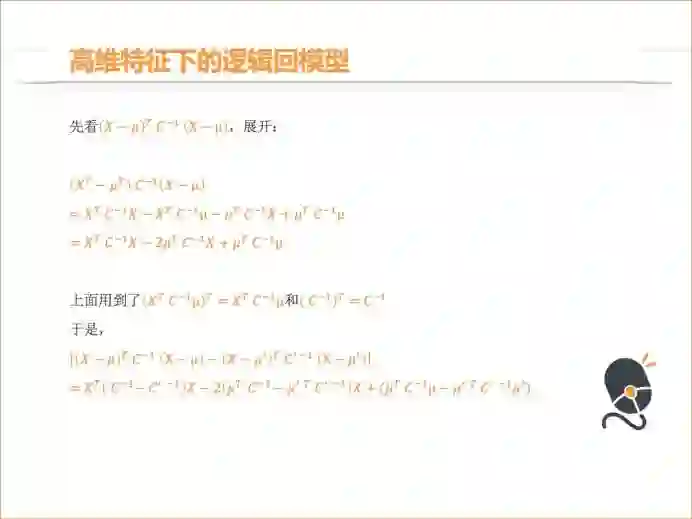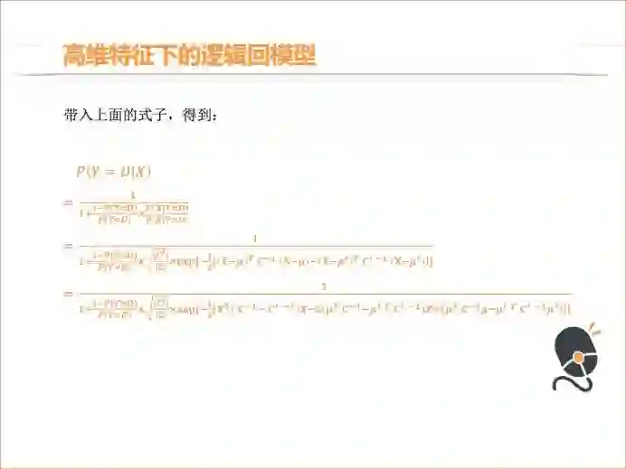 其实这一块无非是线性代数的一些计算。把括号里面的东西展开合并,再做一些变换,最后得到的公式就比较简单了,就是逻辑回归的方程。