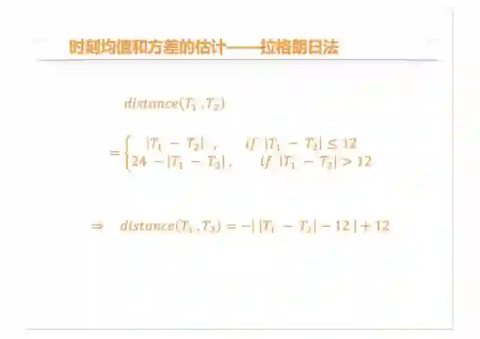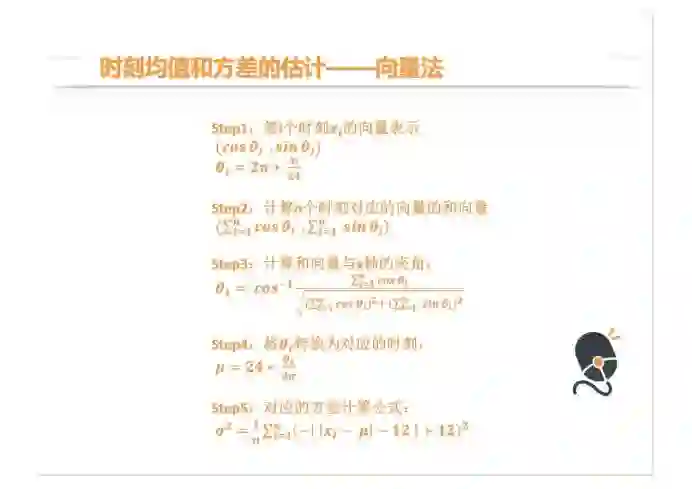 整个算法的流程是这样,首先计算每一个时刻对应的向量表示,也就是把每个时刻转换成向量角度。分别计算它的正弦余弦值,来表示它的 x 轴、y 轴坐标。第二步计算 n 个时刻对应的和向量。第三步计算和向量与 x 轴的夹角,用反余弦公式。第四步把夹角转换为对应的时刻,也就是我们要计算的均值。最后计算对应的方差。