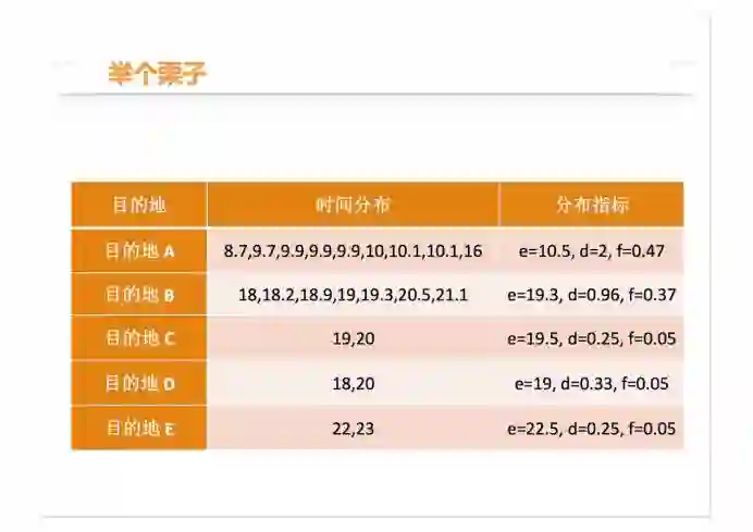 接下来我举一个形象点的例子。这个表是一个用户去每个目的地的出发时间分布,最右边是他的分布指标。