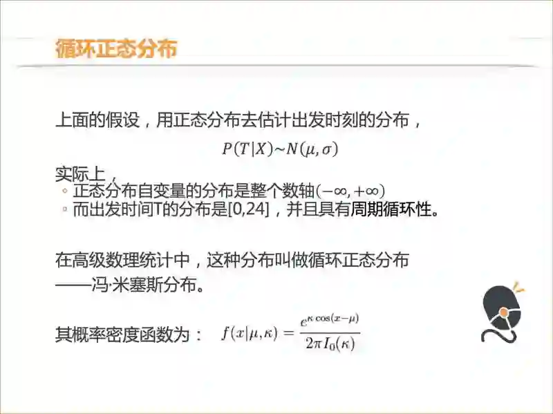 最后还有一个问题,上面我有假设同一用户、同一目的地下出发时刻符合正态分布。这里是有点小问题的,正态分布自变量的分布是整个数轴,从负无穷到正无穷。但出发时刻的分布是 0 到 24,并且有周期循环性。在高级的数理统计里面,这种分布叫循环正态分布,也叫冯·米赛斯分布。