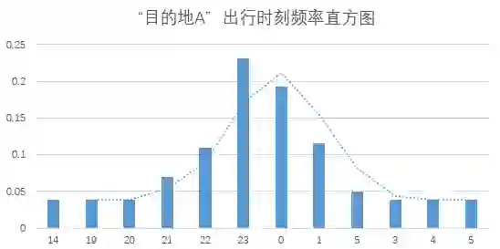 下面是我绘制目的地 A 的出行频率的直方图。这么一看就非常明显了。这个分布非常像经典的数据统计里的正态分布,也叫高斯分布。我们分析了很多个 case 之后发现都跟这个类似,也就是同一用户、同一目的地是符合正态分布的。