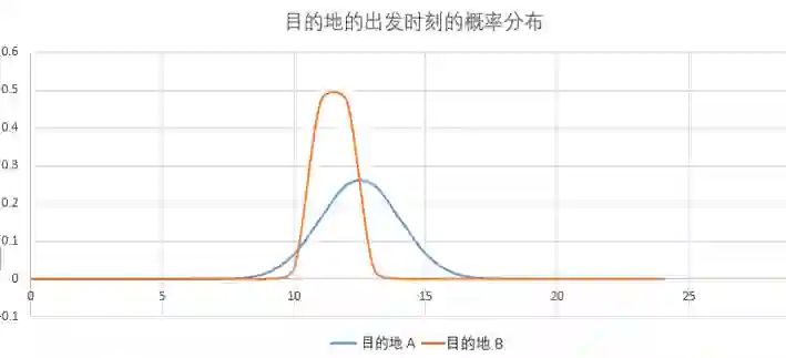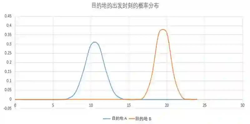 第二个用户,用出发时刻不太能区分他去哪个目的地。他去目的地 A 的平均出发时刻是 12.4,他去目的地 B 的平均时刻是 11.6,这两个时间比较接近。这个用户在 12 点左右的时刻,我们发现他去目的地 A 和目的地 B 的概率都比较高,不太好区分,概率分布曲线有很大的交集。