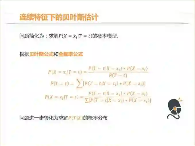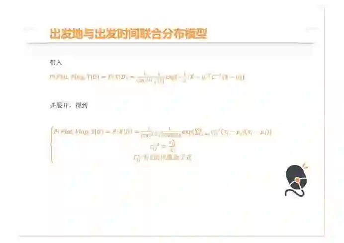 接下来这个问题就进一步简化为,计算在出发时刻这个特征下每个目的地的条件概率,这样一个概率模型。这也就是贝叶斯估计的概率问题,根据贝叶斯公式和全概率公式转换一下,关键要求解的变量,就是在目的地这个条件下出发时刻的概率分布。