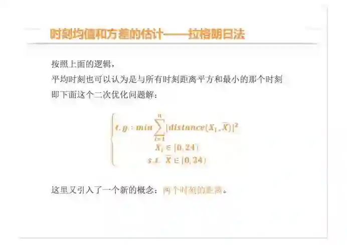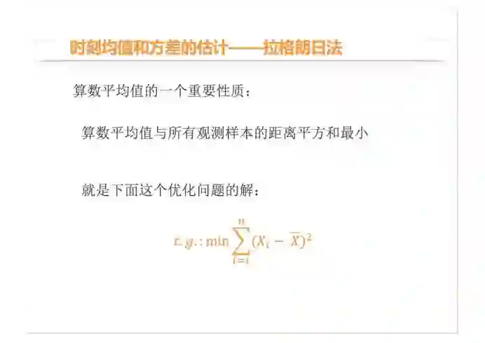 我介绍的第二个方法是拉格朗日法,能解决这个问题。我们先回顾下算术平均值的概念和性质,算术平均值满足这么一个重要性质:它与所有观测样本的距离平方和最小。怎么求解?就是拉格朗日法。
