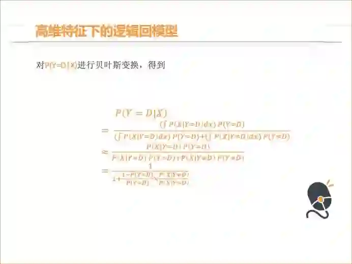 上面这两个方程的含义,可以具象为一个用户去 D 类目的地和不去 D 类目的地的正态分布。要估计的是用户在 X 这个特征下去 D 这个目的地的概率,套用贝叶斯公式变换一下,得到下面的式子。