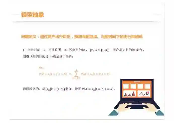 有了问题定义之后接下来就是要把这个问题抽象成预测模型。T 是当前时间,S 是当前位置,X 是预测目的地,我在当前时间、当前地点出发,在这个条件下用户即将去往的那个目的地条件概率应该是远远大于他去其他地方的概率。比如说今天晚上九点我在酒店打开滴滴出行 APP,如果查出我去虹桥机场的远远大于外滩的概率,那么这个系统就猜去我去虹桥机场。这是一个条件概率的问题。