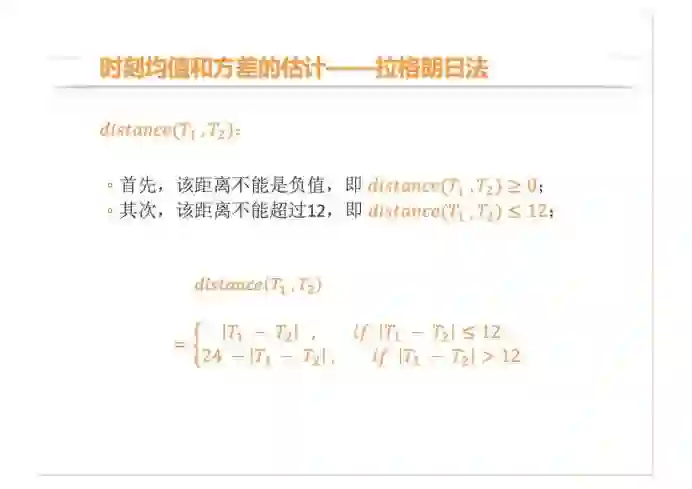 类比一下,平均时刻也可以表示成这个样子,平均时刻可以认为是与所有时刻距离平方和最小的那个时刻。这里引入了一个新的概念,就是两个时刻的距离。那怎么去计算两个时刻的距离?我先看两个时刻的距离应该满足的两个性质:首先两个时刻的距离不能是负值,必须大于等于 0;另外是两个时刻的距离不能超过 12,也就是 23 点和 0 点,它们的距离是 1 而不是 23。有了这两个之后,可以用下面这个分段函数。