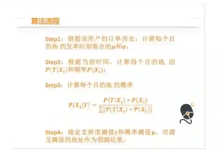 下面是我们整个算法的流程,首先根据用户的历史订单,依次计算每个目的地对应的发单时刻的期望和方差;然后根据当前时间计算每个目的地概率的中间数据;第三步用贝叶斯框架计算每个目的地的概率;最后确定阈值,满足阈值的就是我们要的计算结果。