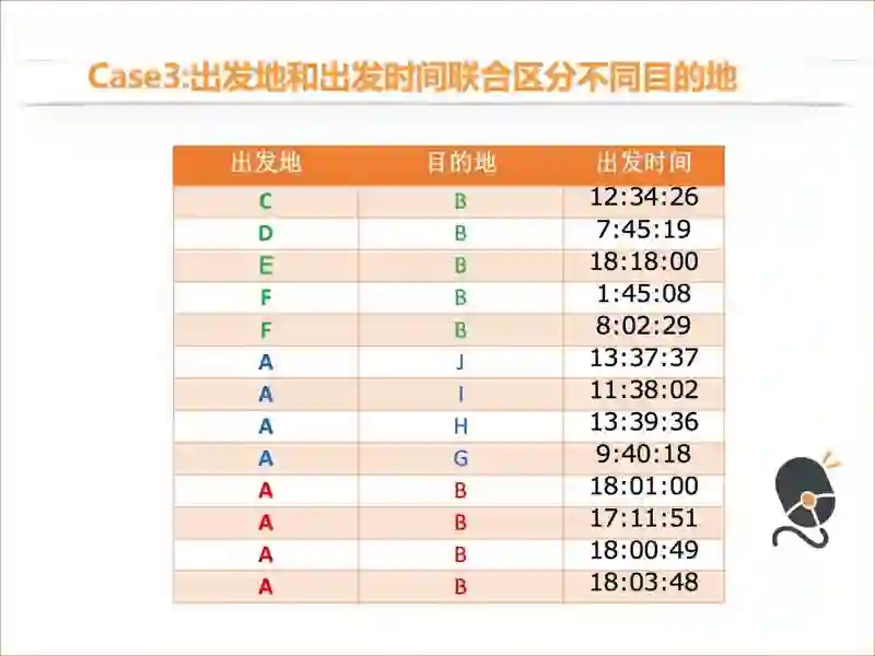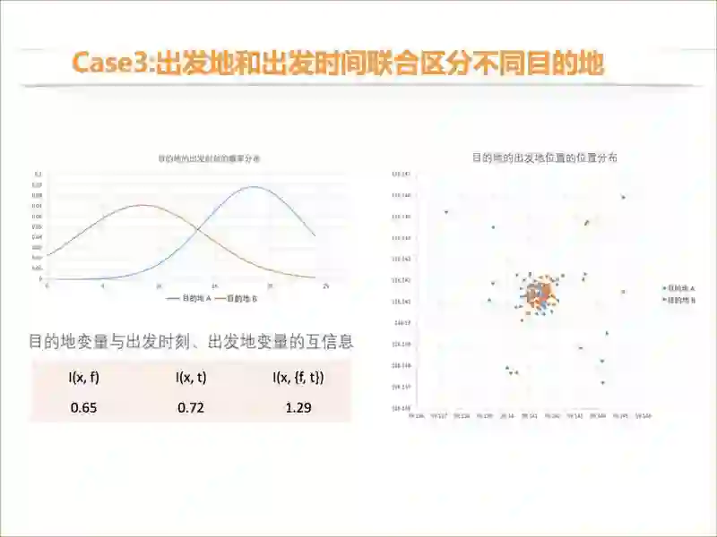 最后一个 case,出发时间和出发地的单一特征都不容易区分,我们可以看一下它的互信息。他的目的地和出发地的互信息不高,目的地和出发时刻的互信息也不高,但他的目的地和出发地、出发时刻两个联合变量的互信息就比较高了。对这个用户来说,用出发地和出发时刻两个变量联合出来,就可以知道他去哪里。我们直接看一下这个列表,如果这个用户是 18 点左右,并且他从 A 地出发的话,他很大概率是去 B 地。