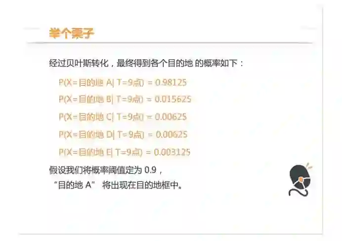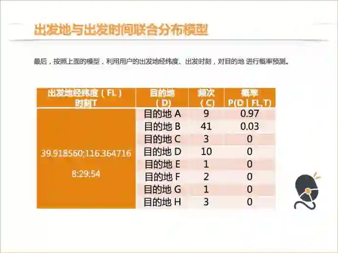 最后用贝叶斯公式转换一下,得到当天时间 9 点这个用户去 A 的概率是 0.98,如果阈值设置的是 0.9,那么目的地 A 就是我们“猜您要去”的结果。